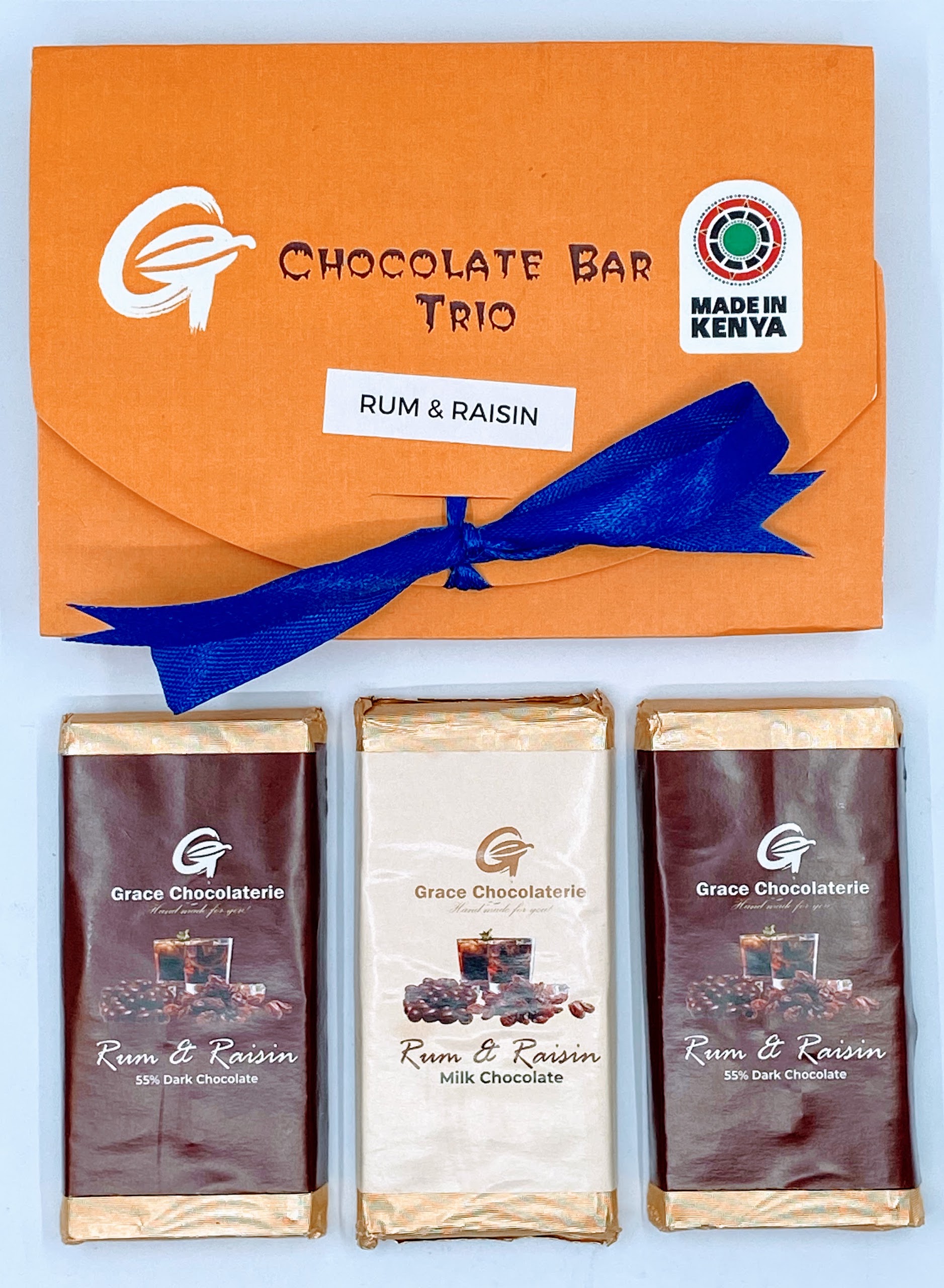 Three 50g Rum & Raisin chocolate bars – 2 dark & 1 milk chocolate – into an attractive box. Our high quality raisins are marinated in real rum for 10 days before being added to the chocolate. Attractive gift, especially (but not only) for men!